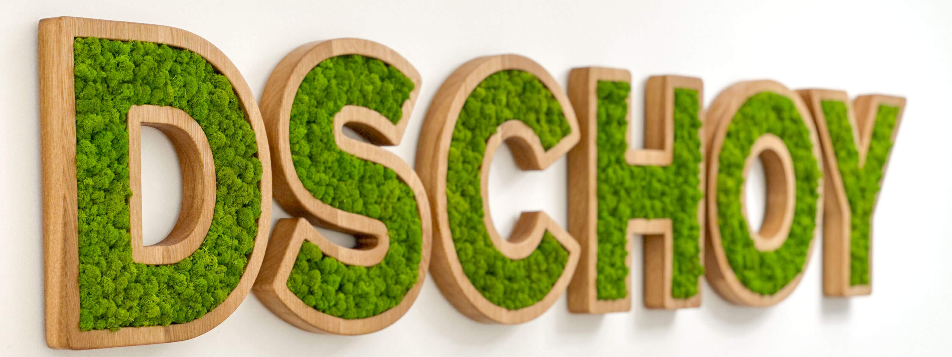 Für die Werbeagentur Kopfsatz aus Chemnitz habe ich 50 cm große Buchstaben im Corporate Identity (CI) ihres Logos aus massiver Eiche gefertigt und mit Islandmoos ausgekleidet. Zwei Jahre später, nach der Fusion mit Creativclicks, habe ich das neue DSCHOY-Logo in derselben Art gestaltet. Dies unterstreicht die Beständigkeit und Qualität meiner Arbeit. Die Buchstaben blieben trotz der Zeit und Umwelteinflüsse unverändert schön und waren von den neu gefertigten nicht zu unterscheiden.