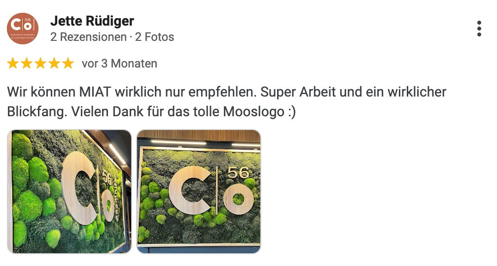 Wir können MIAT wirklich nur empfehlen. Super Arbeit und ein wirklicher Blickfang. Vielen Dank für das tolle Mooslogo :)
