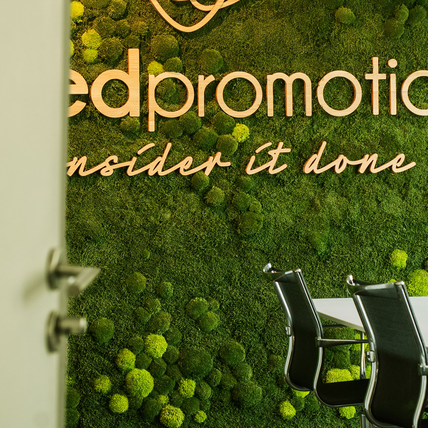Nutze den Schieber, um die Verwandlung eines Raumes durch eine Mooswand mit handgefertigtem Holzlogo aus massiver Eiche zu erleben.