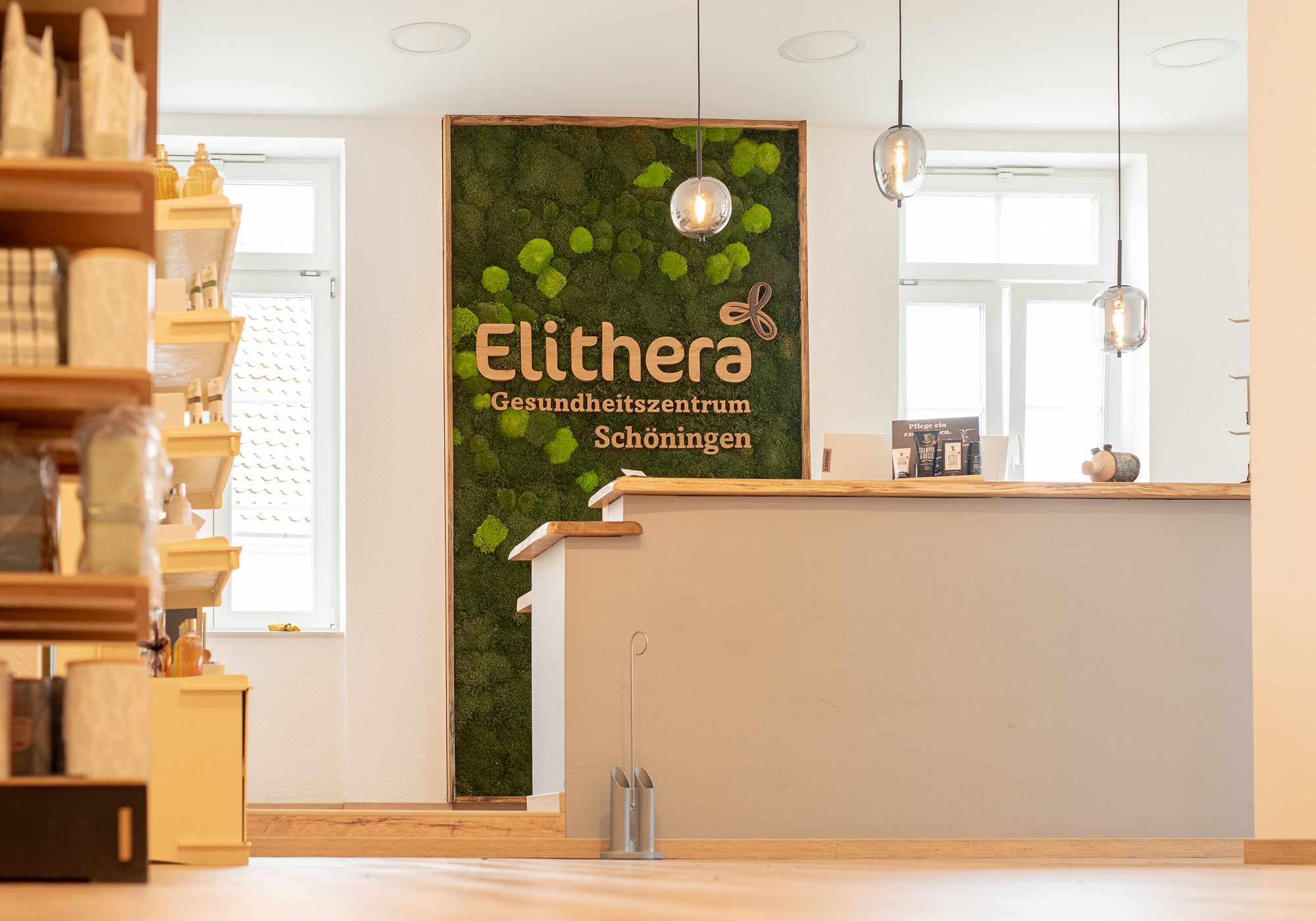Elithera begrüßt eine beeindruckende Mooswand die Besucher und schafft eine einladende Atmosphäre. Handgefertigt und mit dem Logo des Gesundheitszentrums versehen, verbindet diese Gestaltung Natürlichkeit mit modernem Design.