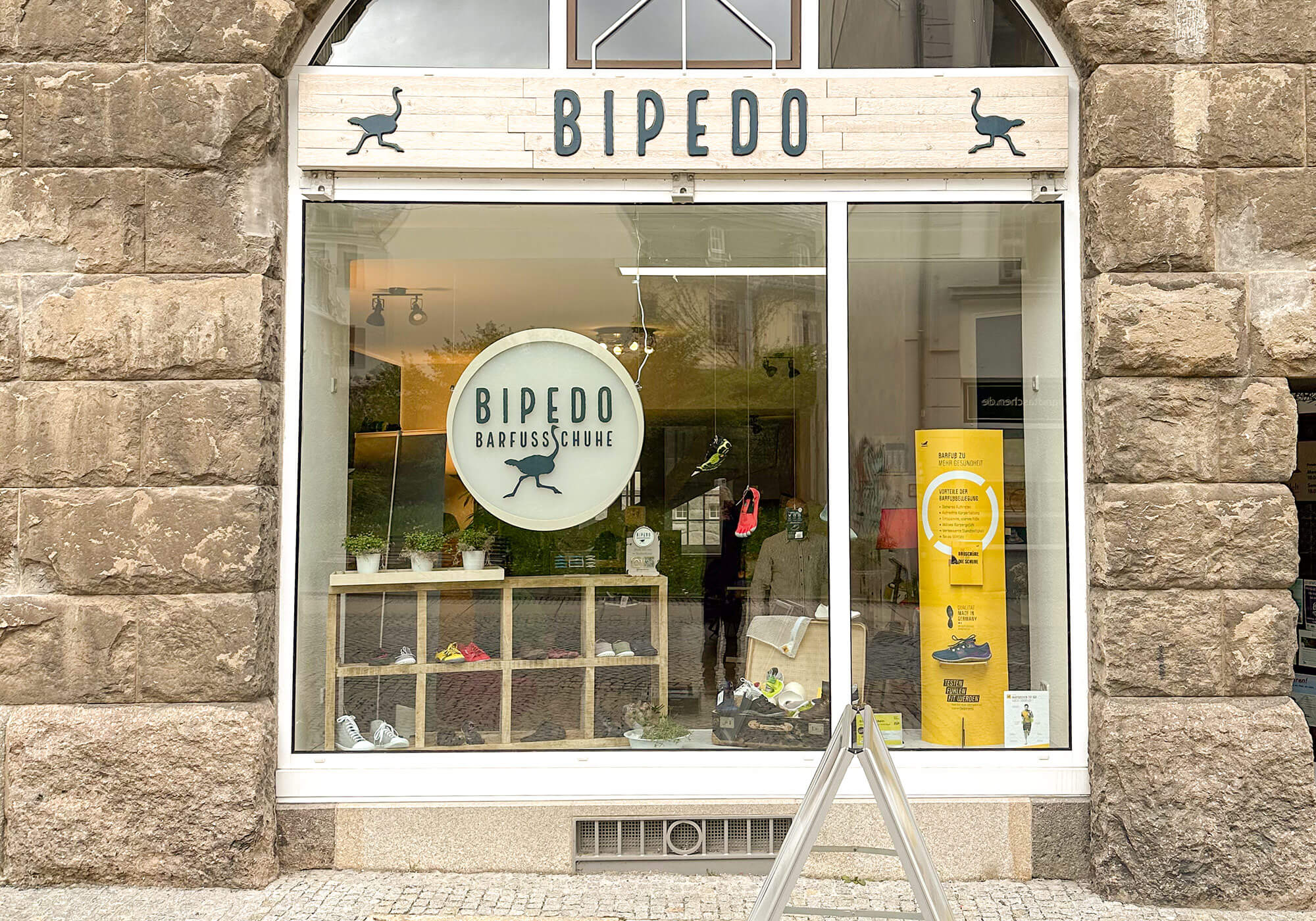 Für das Bipedo Barfußschuhgeschäft wurde ein individuell gestalteter Leuchtkasten geschaffen, der die Werte des Ladens perfekt widerspiegelt. Die alte Konstruktion aus Plexiglas mit Folierung wurde durch eine hochwertige Holztafel ersetzt, die sowohl funktional als auch ästhetisch überzeugt.