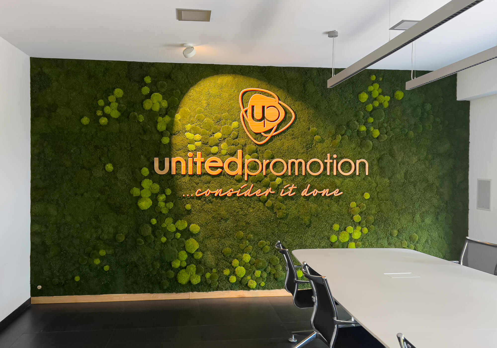 Die Mooswand dient nicht nur als ästhetischer Blickfang, sondern spiegelt auch die Werte von United Promotion wider: Nachhaltigkeit, Kreativität und Qualität. Durch die Integration des Firmenlogos wird die Markenidentität auf natürliche Weise hervorgehoben.