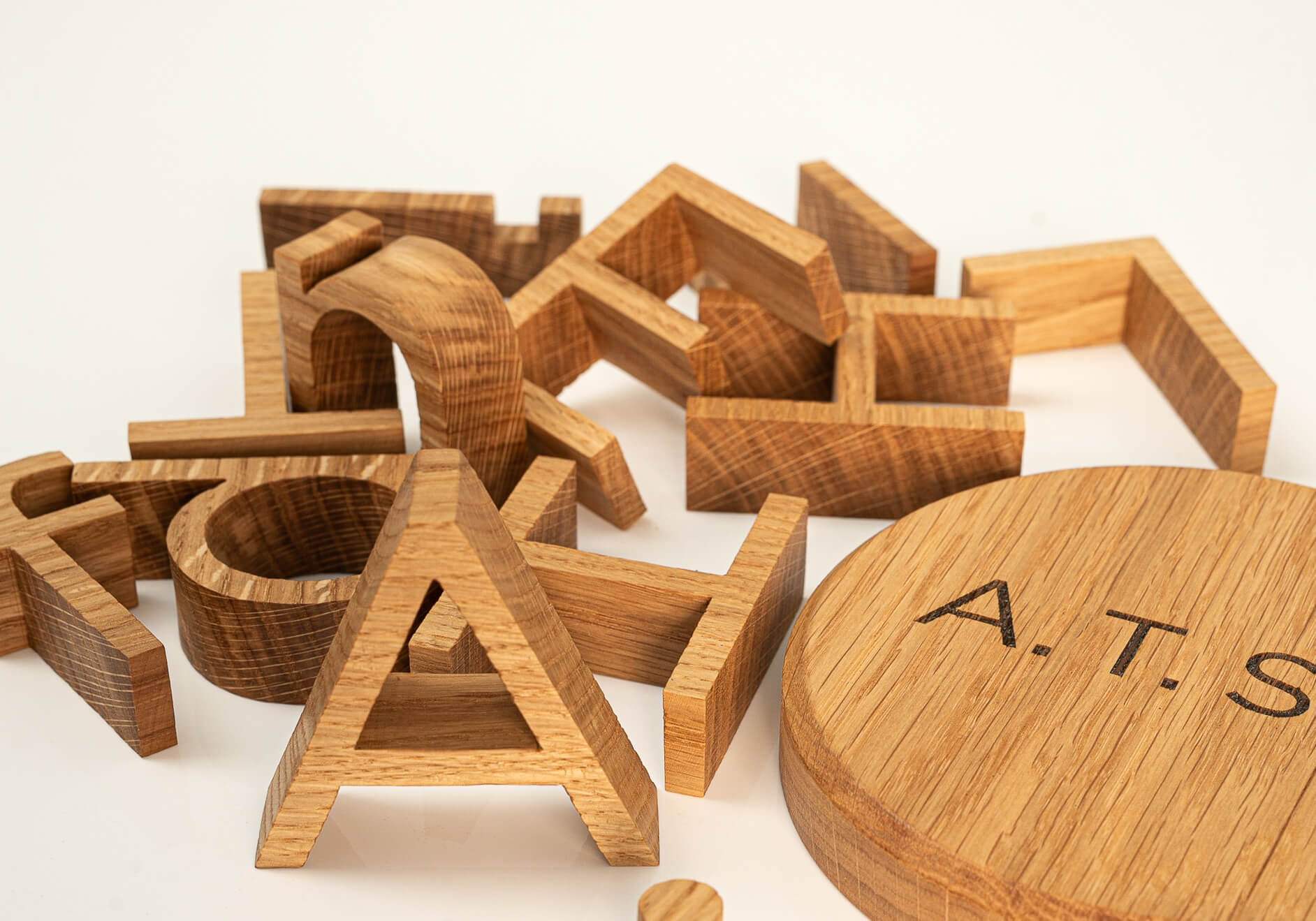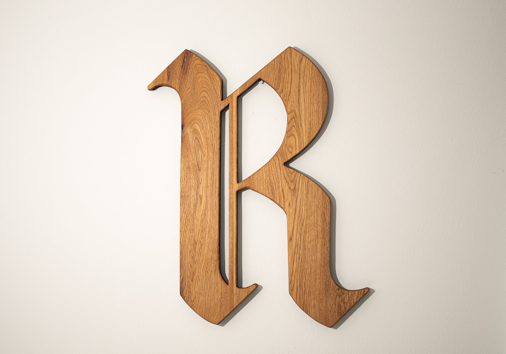 Verleihen Sie Ihrer Wandgestaltung eine einzigartige Note mit handgefertigten Buchstaben aus massivem, 2 cm starkem Eichenholz. Dieses zeitlose Design wird durch eine präzise gelaserte Gravur auf einer Scheibe ergänzt, die jedes Stück zu einem Blickfang macht.