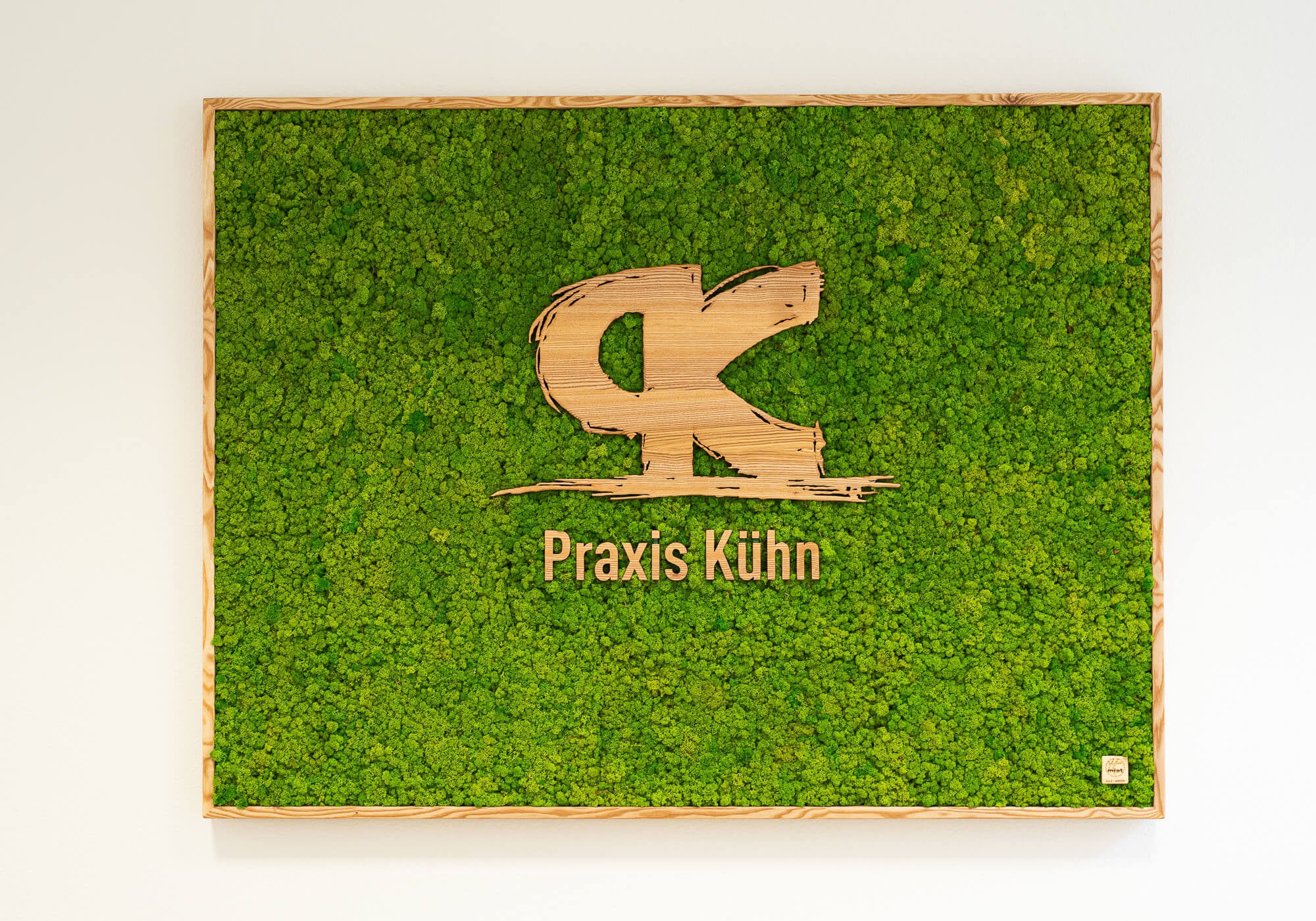Dieses individuelle Moosbild kombiniert das Logo der Praxis Kühn mit einem lebendigen Hintergrund aus hochwertigem, konserviertem Moos. Der Rahmen aus Naturholz und die filigran gearbeiteten Echtholzbuchstaben schaffen eine einladende und entspannte Atmosphäre – perfekt für den Empfangsbereich einer modernen Praxis.