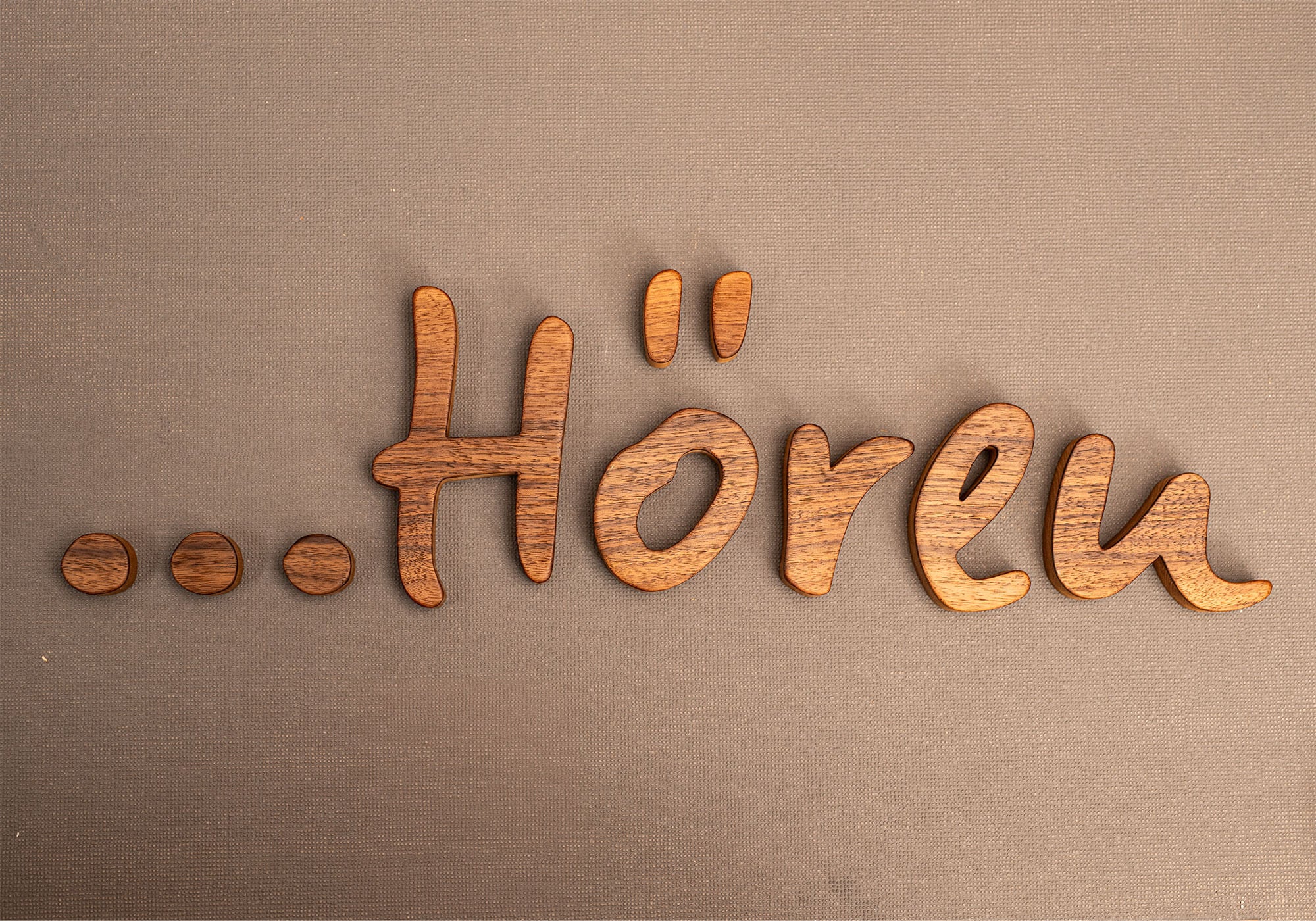 Das Wort „Hören“, ein zentraler Teil des Slogans „Hören neu erleben!“, wurde für das Hörstudio Schäfer & Speckert in Bad Dürkheim aus hochwertigem Nussbaumholz gefertigt. Dieses edle Material unterstreicht die Werte des Unternehmens: Qualität, Präzision und Exklusivität.