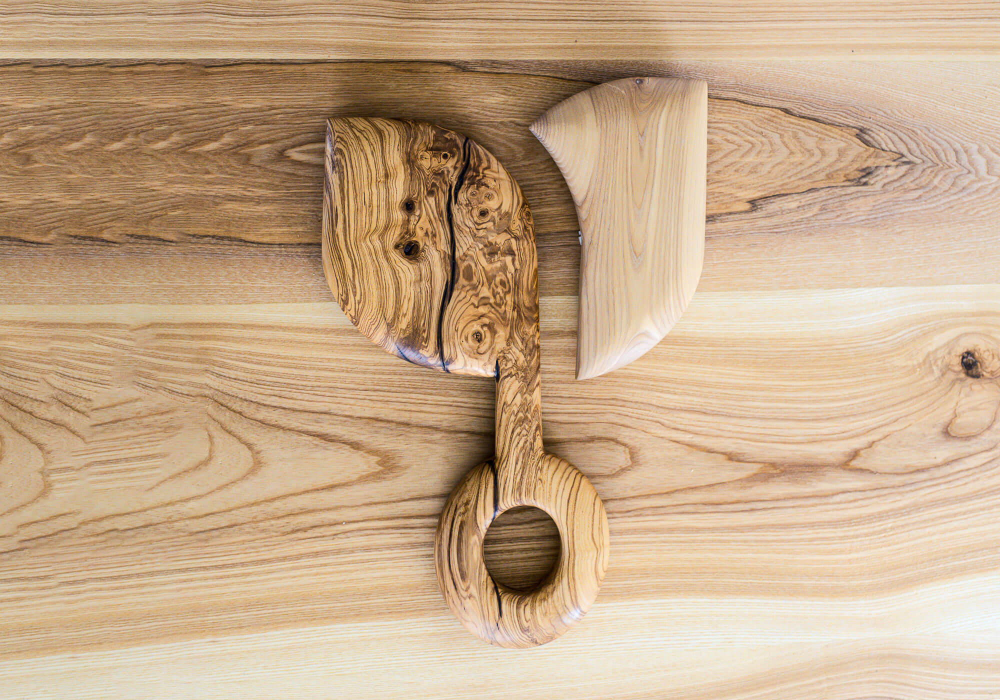 Dieses einzigartige Logo in der Form eines Blattes verbindet die ausdrucksstarke Maserung von Olivenholz auf der linken Seite mit der klaren, hellen Struktur von Esche auf der rechten Seite. Die Kombination dieser beiden edlen Holzarten verleiht dem Design Tiefe und Natürlichkeit.