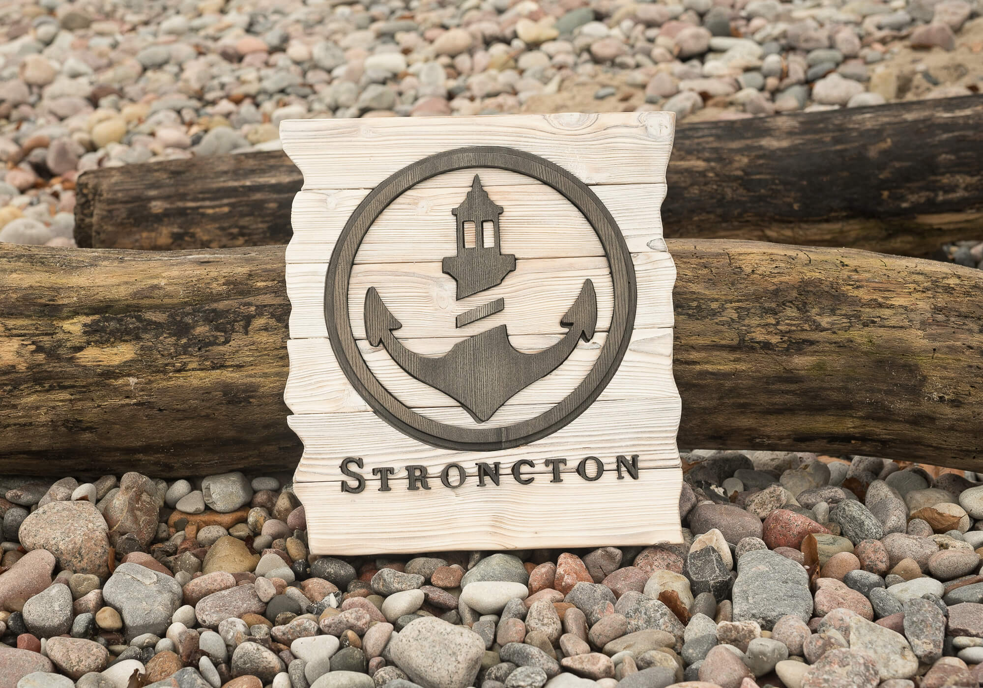 Das Logo, gestaltet von Stroncton – Design x Creative Company aus Oberösterreich, wurde von Miat Holz Design mit handwerklichem Können und Liebe zum Detail gefertigt. Die natürliche Maserung des Holzes und die filigranen Elemente wie Anker und Leuchtturm bringen die maritime Identität von Stroncton eindrucksvoll zur Geltung.
